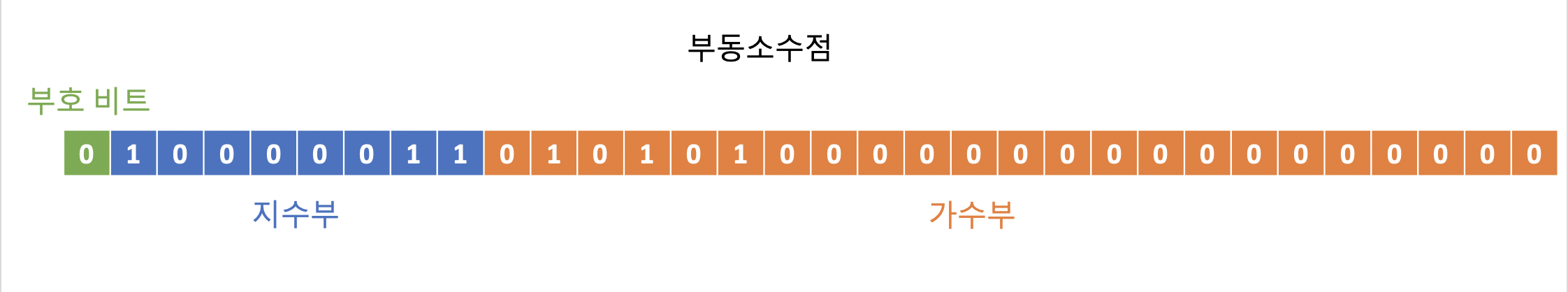 부동소수점 역시 첫 번째 칸은 부호비트이다. 다만 그 다음 8칸은 지수부, 나머지 23칸은 가수부이다. 부호 부분엔 실수가 음수일 경우 1, 양수일 경우 0을 자리시킨다. 지수부는 위 설명에서의 n에 bias를 더한 값을 2진수로 변환한 수를 넣는 부분이다. bias는 32비트에서는 127, 64비트에서는 1023이다.